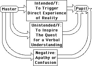 The Master knows that the Word Filters of the Verbal World block the Direct Experience of Reality. Thus he attempts to strip this Verbal world away in anyway he can. Unfortunately the Pupil thinks that his Verbal world is Real and so fights back. Inevitably, or at least frequently, the Master realizes that simply pointing to the Experience is not enuf, because the Verbal Jail, which has been self constructed with a little help from friends, family and culture, is so strong that it deflects any suggestions which point beyond the petty world of Words. At this point the Master understands that he must use Words to deconstruct the Verbal Box which surrounds much of Humanity blocking them from the Bliss of Being.