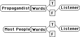 This is the worst scenario, because Speaker and Listener think they know what they are talking about and that they understand each other completely when neither has any idea what they are really meaning or saying. This is the worst because both Speaker and Listener think they understand each other and know what’s going on. This is contrary to the previous scenario, when the Speaker knew what he was saying and the Listener was consciously pretending to understand. In the case where both think they understand, they are incredibly resistant to external clarification. This is the scenario the Propagandist thrives on.