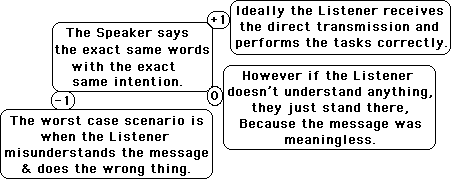 In the ‘trash can’ scenario, the Listener who took out the trash and put it in the trash can would be given a score of ‘+1’. The Listener who didn’t understand the language would be given a ‘0’. We might give partial credit of ‘+1/2’ to the individual who just took the trash outside, because he understood the content but not the context. His behavior was half right. The ‘-1’ score could be reserved for an idiot who took the trash out for dinner - or the teenager who misunderstood completely thinking that his mother was finally approving his trashy girlfriend.