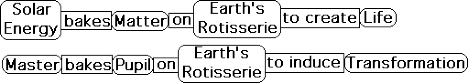 The Master cooks the Pupil in a similar fashion – with steady pulses of vitality over long periods of time. Due to the regular alternation of day and night, this process is never continuous - always in pulses. Both of these transformational processes are alchemical in essence. The Sun bakes Matter on Earth's rotisserie to create Life. The Master cooks the Pupil on the same rotisserie to induce transformation. Due to the parallels between these systems, the Author will employ the Rotisserie Process as a prime metaphor for spiritual transformation and growth.