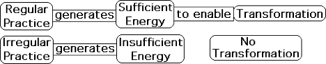 If the Pupil's Practice is irregular, very little, if any, 'transformational heat' is generated. If this 'heat energy' is insufficient, the bonds that tie us to our illusions are not broken. Remaining Matter, we respond automatically to environmental stimuli. Unable to exert any control over our behavior, our past momentum victimizes us emotionally. Constantly upset about one thing or another we are unable to experience the glory of just Being.