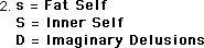 Let us illustrate these concepts through our familiar equations for pollution. First we state the classic pollution formula in terms of the self. We symbolize this Fat Self, by the Polluted vector with the lower case letter 's'.