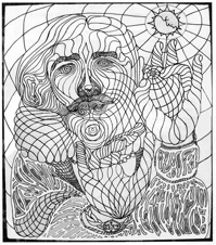 Although my Person had never done much drawing besides a few scribbles and these assignments, he became obsessed with this project – perhaps due to the explosive force of our hero’s Right Brain breaking free after being confined in the Left Brain box of school and more school for so much of his life. Or perhaps it was due to a combination of psychedelics and pot. (Impossible to test – no real control group.) My Person spent many sessions and even more hours drawing, erasing and redrawing the intricate, weaving, interlocking lines to get them flowing perfectly, economically and naturally, into each other. (Evidently still inspired by the cosmic vibrating lines of Ngady’s Bushongo initiation mask. Finally completed after an unknown length of time (as it was created in the prehistoric period of my life – pre-Record Keeping (for the sake of the Books let’s approximate 10 sessions and 20 hours – a lot of time for a mere drawing)) I presented my accomplishment to Brad.