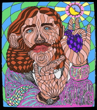 Begin a computer edit of a scanned image of my youthful self portrait – with total immunity from mistakes – as the image is just encoded in yes and no electronic bits – and easily duplicated - unlike a unique one of a kind oil painting – where each dab of paint is seen forever. A typical Artistic explosion, though brief, 8 days straight, 13 overall – nearly 3 hours per session (could barely quit – despite my weakened state). Perfected many lines – experimented with color combinations on the intricate drawing - quickly frustrated with computer art and pixilization – the impossibility of evoking the spontaneous and random - the subtle shading and blending of hues – the magic brush of the Renaissance palette. So faced with these limitation and not quite stable and strong enough to attempt this bold painting – came to another abrupt halt.