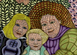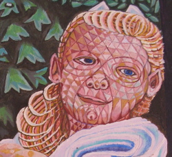 It’s easy to understand Wife L’s response when viewing his paintings, because many of his representations are based in pure abstraction – without even a slight nod to reality - for instance Laurie’s lovely, curly hair, which he has portrayed frequently in a variety of patterned stylizations - notably Tulum, but also My 3 Women, and in Master Ni - not to mention his constant segmentation of faces into countless tiny prisms. Indeed L’s face in Tulum has been regularly referred to as an iguana face. So for D, my person, to say that he was giving up reality – implied that he perceived his wife with iguana skin and some type of bubble hair – which was, of course, manifestly absurd. When the contradiction hit consciousness it exploded in merriment and hilarity at the paradox that he could be uttering these insane words so assuredly – as if he actually believed them. Not only that but he had the gall to sincerely maintain that his works were based in realism – which, of course, ignited more uproarious guffaws.
