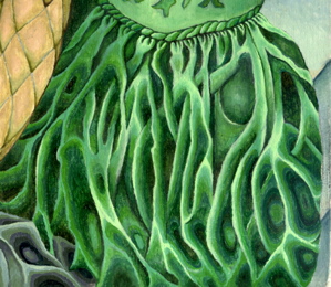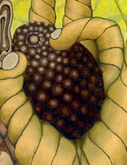 As with The Womb, the Ngady mask was also a heavy influence on this drawing. The flowing lines of force – almost geometrical in nature – are in the hands, the face, the avocado, even the sky. Indeed the irregular fabric was the only element of the drawing left unfinished, and was perhaps even a paralyzing factor to the actual initiation of the painting. Indeed when reaching this section of the painting at the present time (the last part to be colored) there was a pause and sigh before moving forth. Perhaps the lack of easily identifiable order inhibited progress for a Left Brain control freak, like myself. But then the breakthrough - the outburst - into chaotic understanding. Breathtaking – as the sleeve of the shirt becomes the paradox that seems real – a great example of something on the edge of reality and abstract.