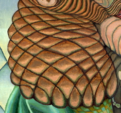 Another section from this painting that illustrates the Edge of Reality principle is the avocado – obviously some kind of dark fruit or vegetable held in the subject’s right hand. My father-in-law Ted immediately identified its nature – a Dickinson avocado, as opposed to Haas. Obviously its recognizable reality is high – not just any avocado, but a specific variety that came from the Tree - the huge avocado tree in our bachelor yard of the house that my Person lived in at the time of the drawing. So while the fruit is clearly real, the representation suggests the firmament of heaven – with stars sparkling in the darkness. This is why Laurie deemed it a cosmi-cado (cosmic avocado – duh!) The solidity of the fruit dissolves in the celestial vision of the blackness behind a starry night. (“Not quite. Stars are never as regular as that.” L)