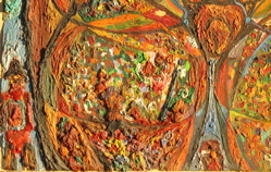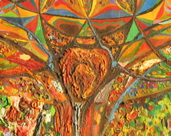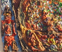 She overwhelmed him – both the intensity of the process and the resulting product – still does. Knowing nothing about the craft of oil painting – he went into a frenzy for, who knows how long (definitely prehistoric) - but probably months. In this divine possession he created a 3D painting with his oils – real ridges and valleys created by the laborious application of paint (still wet over 30 years later when this exquisite creation of the subterranean realms of consciousness was inadvertently squashed in the evacuation from the wild fire of 2009.)