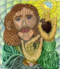 The avocado-holding hand points to a Sun/Moon face, which radiates light over the entire picture. This symbol replaced the astrological symbol in the 2002 redrawing. On the verge of retirement Master Ni, his Tai Chi teacher from when he had penciled the original ‘74 drawing, had given him some cryptic calligraphy – – which contained ming with its sun/moon symbolism – representing the merger of the inner and outer lights – the integration of inner and outer. (Read an excellent explanation of this symbol by the unknown Taoist – which arrived serendipitously as I was engaged in the painting – inspired by Master Ni’s last meditation class – given at the age of 95. See how my entire life is woven together by the visual threads of this painting.)