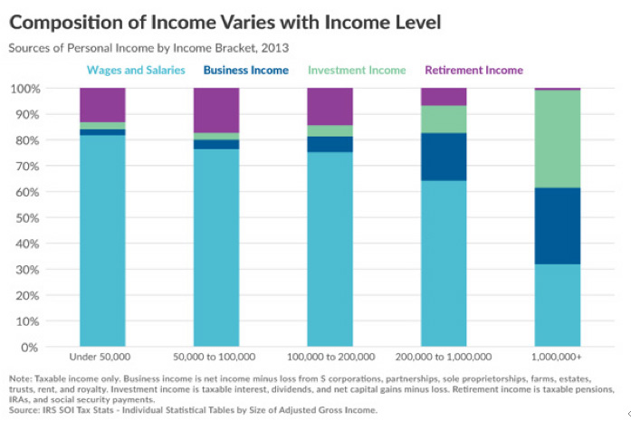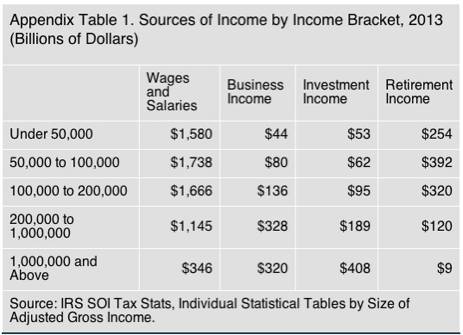 Interesting. Those earning over a million dollars a year generally receive a substantial portion of their earnings from Investment Income, i.e. interest, dividends, and capital gains. Nearly 40% of all the income generated by those in the graph’s top bracket is Investment Income. Only for the million-dollar per annum income group does the percentage for Investment Income actually exceed the percentage earned by either Business or Earned Income.