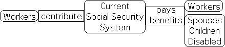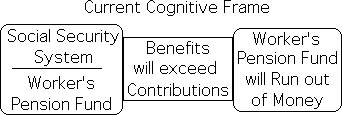The Mass Media employs, thereby encouraging, the cognitive frame that the Social Security System is a mandatory Pension Fund for the Working Class, a type of insurance against aging. Once the frame is established, the reasoning is straightforward. This mandatory Pension Fund for the Working Class will run out of money because benefits will exceed contributions. This imbalance will deplete the Fund in the not so distant future. In other words, the Social Security Fund, the Worker's Collective Savings Account, will run out of money and won't be able to pay benefits.