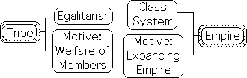 Tribes emerged during the Paleolithic, when humans lived as Hunter-Gatherers. Tribes are egalitarian, classless societies. The primary function of a Tribe is the welfare of its Members. In contrast, there are at least 2 classes in the Empire Model, the Wealthy Leaders and the Working Class. Further, the primary motive of the leaders of an Empire is expansion.