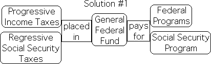 Once the Social Security System is recognized as the Federal Program that it is, a simple solution to its supposed financial woes emerges readily. Pool all taxes, Progressive Income and Regressive Social Security, into one Federal Fund. Include the Worker's Pension Program with the rest of the Federal Programs. Treat it like the Agriculture Department or the Department of Defense. Spend money from the General Fund as is necessary and run an enormous budget deficit if required. Business as usual.