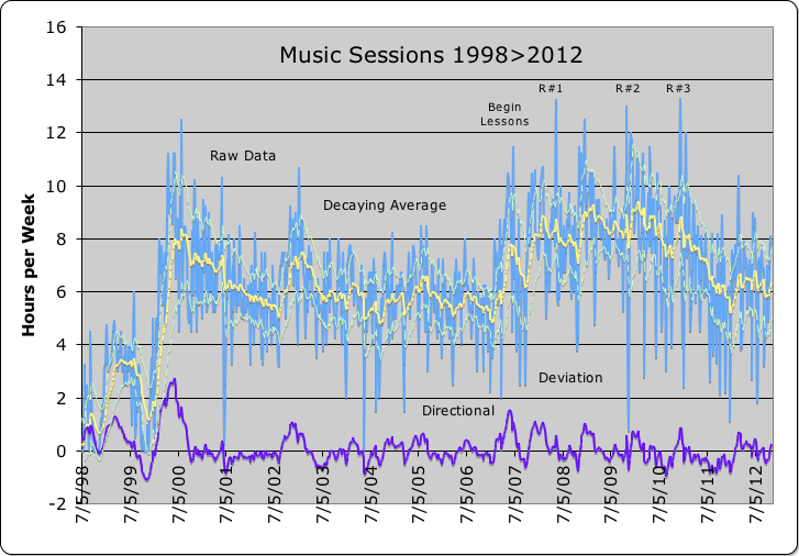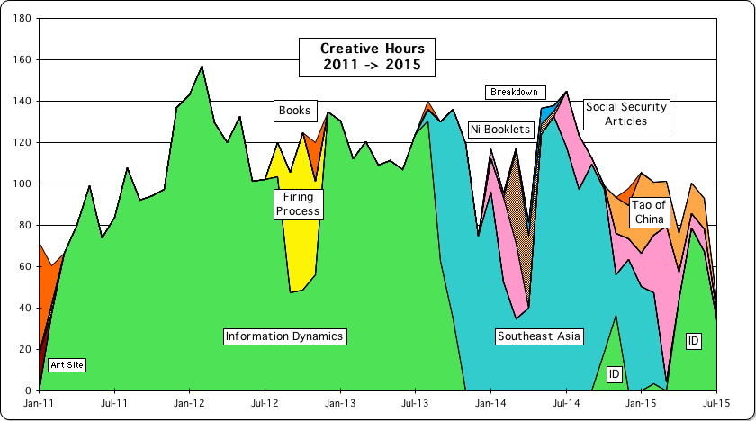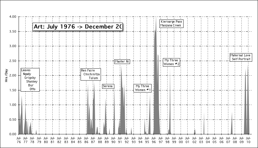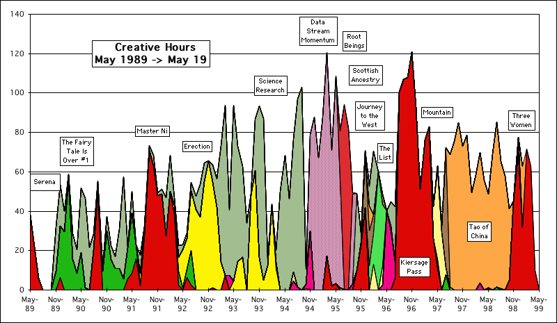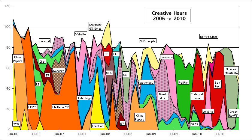 Following are charts containing the number of monthly hours that my Person participated in the variety of creative projects he has been involved in from 1989->2010 – just 22 years. Also included are graphs of the time he has spent on his Art, Exercise, Music & Tai Chi.