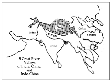 The Himalayas define Asia. This rugged mountain uplift was presumably caused when the Indian sub-continent rammed into the Eurasian continent some 40 million years ago. The high mountain ranges are the source of an abundant water supply. Indeed five major river valleys of the world originate in the Himalayas. Starting from the west, the Indus River valley defines the western border of the Indian subcontinent, while the Ganges River valley defines the eastern border. Between the Ganges River valley and the Chinese river valleys is the Mekong River valley of Southeast Asia. Circling northward, the merging river basins of the Yangtze and the Yellow River define classic China.