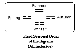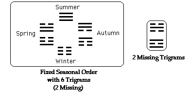 The ‘field of action’ for the bigrams is fixed, resulting in no possibility of good or bad fortune. However, there is not a logical sequence to the 8 trigrams that is fixed in every situation. Hence there exists choice and thereby the possibility of good and bad fortune. See seasonal trigram cycle below with missing trigrams that begin to expand the ‘field of action’.