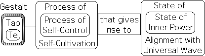 Tao and te form a gestalt (a fully integrated, yet separable, network). Te’s process of self-control is a feature of the Tao’s ideal self cultivation practices that lead to te’s inner power that accompanies alignment with the Tao’s Universal Wave.