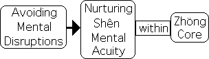 Avoiding these disruptions is the process of ‘grasping shên within our core (zhöng)’. The ideogram for grasping can also be translated as ‘getting, developing, nurturing, or preserving’. In order to nurture shên’s ‘genius’ we must avoid the sensuous cravings that disturb the tranquility of hsin (heart-mind). Disrupting hsin’s tranquility repels shên's ability to 'intuitively understand the myriad things' or alternately ‘clearly illuminate and order incoming sensual input’.
