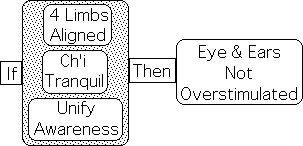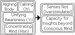 What is the process for refining/concentrating ch’i in order to attain this state of insight (L14) and readiness (L2)? Aligning (cheng) our 4 limbs, calming (ching) ch’i, unifying awareness (yi), and concentrating our mind (hsin), has two results. The eyes and ears, i.e. senses, won’t be over-stimulated and the far off will seem close at hand.