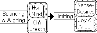 Evidently both sensual cravings and excessive emotions, positive and negative, undermine the jing/body balance that is a foundation of vitality. By focusing upon balancing/aligning both ch’i (breath) and hsin (the emotional heart-mind), we can avoid dwelling in these unbalanced states that undermine our health.