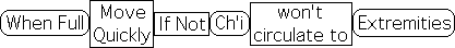 ‘When full, move quickly’, presumably to stop eating. If we continue to eat after we are full, ch’i won’t circulate to our limbs. In modern terms, overeating impacts our circulation. Decreased blood flow limits oxygenation, which of course diminishes both our life force and mental acuity.