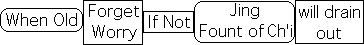 Again this statement could be generalized to include any age and any out-of-control thought-emotion. Jing, the fount of ch’i, will drain out if we don’t forget/temper our thought processes. This tempering process presumably consists of exercising the te-yi intention synergy to both restrain and redirect our thoughts.