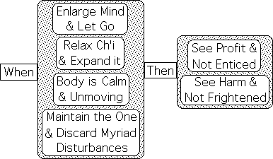 Engaging in 4 meditation-like processes yield positive results. The practices: 1) ‘enlarging and letting go of hsin (the heart mind)’; 2) ‘relaxing and expanding ch’i (the breath)’; 3) ‘a calm and unmoving body’; and 4) ‘maintaining the One and discarding the myriad disturbances (the 10,000 things)’. Following these practices results in ‘seeing profit and not being enticed’ and ‘seeing harm and not being frightened’.