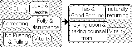 Positive Consequences: Calming (ching) emotions, rectifying (cheng) behavior, and resisting the temptation to do too much results in both good fortune and the Tao naturally returning. Further instead of being depleted or erratic, we are able to rely upon and take counsel from our vitality.