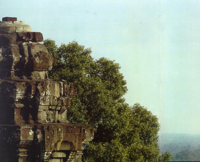 While experiencing the sunset at the Mountain Top Temple on our last day in Angkor, would have been a great finale to our visit - it sounds so romantic, instead the skies were filled with turbulent clouds which obscured our celestial friends. But we didn’t care. It felt good to be out in nature, straining our muscles with a little exercise. We finally reached the mountain top, which was relatively flat. Ahead of us by 20 or 30 yards was the five tiers and the upper terrace of the temple. It seemed to be in great disrepair - a pile of crumbling rock. We decided that we had enough temples for the day. We turned around to survey the land. Just like in the Yucatan it was mostly vegetation as far as we could see, but then peaking above the tall forest cover I spied what seemed to be some odd type of plant. Then in nearly the same perception I realized that they were the spires of Angkor Wat reaching towards heaven.