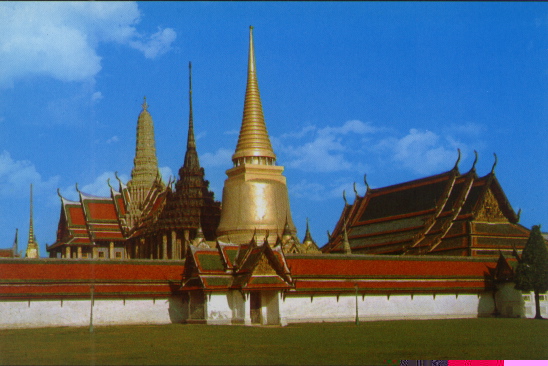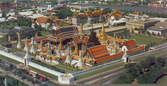 We entered a small minivan. Guide: “Now we’re going to the Grand Palace. It was begun by Rama I, but the Thai kings who followed have added their own structures and restored the old. Most of our kings have lived here. Our present king used to live here but has moved to the south for health reasons.”
