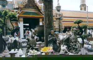 Guide: “The Emerald Buddha is the most revered image of the Buddha in all of Thailand. It is carved out of jade and so looks green like an emerald. It was discovered in the 1400s and enshrined at Chiang Mai, the northern capital. After expelling the Burmese Taksin sent one of his generals, Chao Phraya Chakri, who was to become Rama I, on a punitive campaign to the north of Thailand. At this time he captured the Emerald Buddha and brought it south. When he became king he began construction on the Grand Palace, which included the Royal Chapel, which houses the Emerald Buddha. During his reign he installed the Emerald Buddha there with great pomp and ceremony. We will see him today. It will probably be one of the highlights of your trip.”