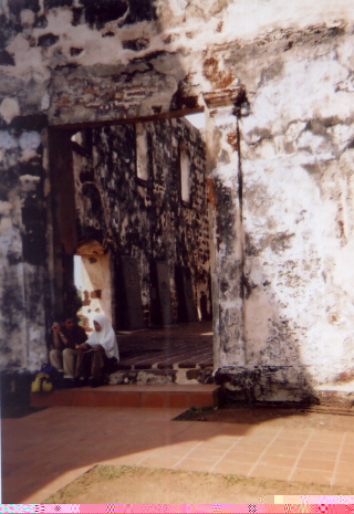 By this time we had seen the Batu caves, the Chinese temple, and the Muslim mosque, indicating vital thriving communities of Hindus, Chinese, and Moslems in Malaysia. Here we find the bare crumbling walls of an old Catholic Church built over 400 years ago by the Portuguese. No local Christian community has maintained it. Indeed there was no visible European presence here despite the fact that Malacca had been run by European powers continuously for over 400 years, from 1511 to 1958, when liberation was achieved.