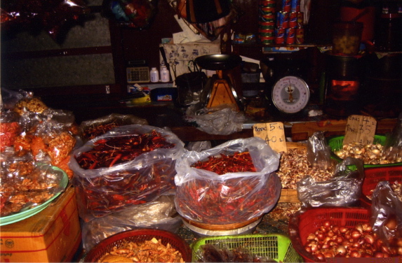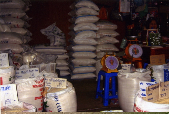 As we strolled down the streets of the city almost immediately we happened upon a local food market that was setting up for the day. This was no tourist affair with sellers hawking their wares in multiple languages – no gaudy beads, Thai hats and T-shirts printed in English. This was a food market for locals. None of the vendors spoke any English; none of them engaged us in anyway. As we walked on plank floors we saw row upon row of multiple types of rice sold in bulk – no plastic packaging here, myriad spices, also in bins, not in containers, and unrecognizable produce.