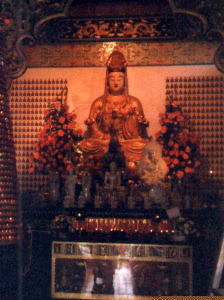 The front of this interior temple is separated into three sections by ornate white pillars. Inside each section was a huge statute of a Goddess. I recognized my friend Kuan Yin as the statue on the right. I rushed inside to greet her. I was reminded by one of the Chinese ladies guarding the temple that I had to remove my shoes.