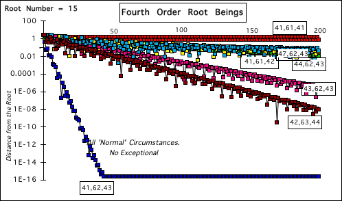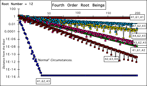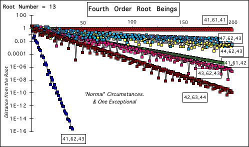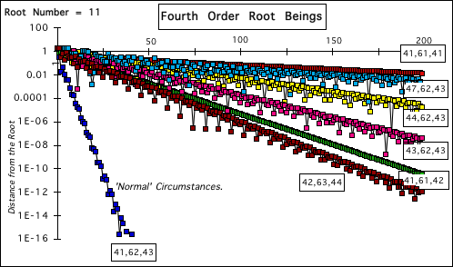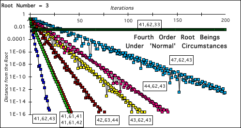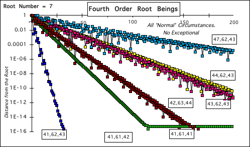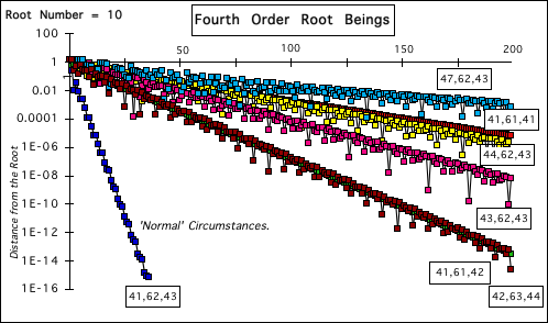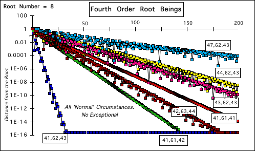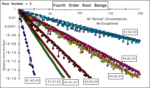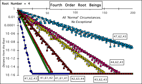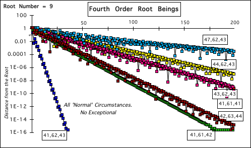 When the Root Number becomes 4, each Being approaches their Destiny a little more slowly still. The slowest Bogus Equation only reaches 9-place accuracy after 200 iterations. The True Root Equation reaches computer accuracy quickest, after only 25 iterations.