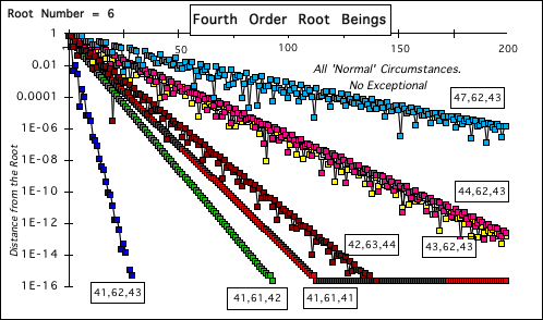 When the Root Number is 6, three of our Past-based Root Beings donÕt reach computer accuracy after 200 iterations. The slowest only reaches 6-place accuracy. Note that the Past Based and the True Root Being all approach their Goal erratically, while the Now-based approaches their Goal steadily without wandering. However the True Root Being still approaches most rapidly even though its Path is erratic.