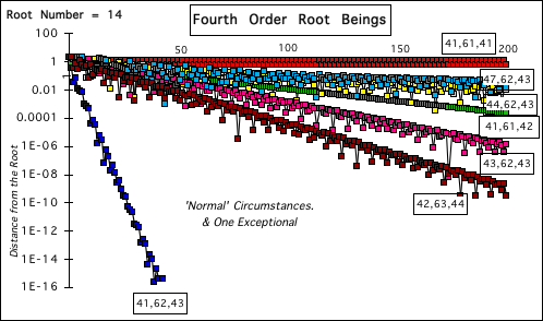 When the Root Number becomes three, the approach to their Goal, their Holy Grail, becomes slower. Already the most Past-based Root Being of this computer experiment doesnÕt even reach computer accuracy within 200 iterations; it only reaches about 13 digits of decimal accuracy. However it is easy to visually see that each of our Root Beings, except the False Root Being, the flat green line, steadily if slowly still approach their goal. The True Root Being still approaches most quickly. The Now-based Root Beings are just a little slower while the Past-based Root Beings are the slowest of all. The False Root Being has slightly different coefficients and is approaching a distinctly different goal. Therefore it ÔHits the WallÕ.