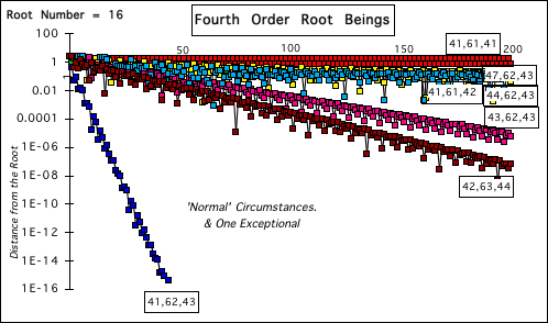 As the Root Number reaches 16, only two of the Past-based equations reach four places of accuracy after 200 iterations. The True Root still reaches computer accuracy before 50 iterations. However all of the Root Beings except All-Now continue to steadily approach the Root.