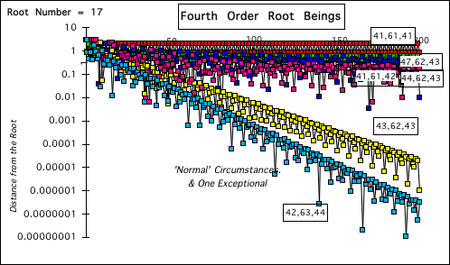 Let us take a little closer look at our Root Beings by eliminating the True Being from our graph/picture. When the Root Number is 17, only two of our Bogus Equations still approach their destiny. The Rest seem to have dissipated or bifurcated. None of them reaches more than 1 place accuracy regularly over 200 iterations. All-Now is visibly bifurcating in this snap-shot.