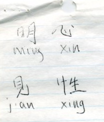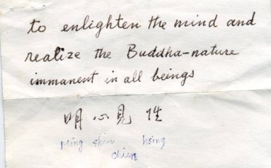 Interestingly enough Master Ni, my Tai Chi teacher, while very silent and mostly non-verbal, once presented me with a handwritten note in English and Chinese. The English said: “To enlighten the mind and realize the Buddha-nature immanent in all beings.” Because of the scarcity of his communications this little missive immediately attained an almost sacred nature to me.