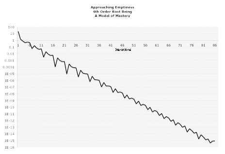 Below is a graph of a 4th Order Root Being. With each iteration (repetition, practice session) he gets closer and closer to his goal, which is the fourth root of some number (towards the right on the horizontal X-axis). Note that the progress, while continuous, is very erratic. As such this journey mimics the Quest for Mastery. Let’s see what we can learn from the Root Being.
